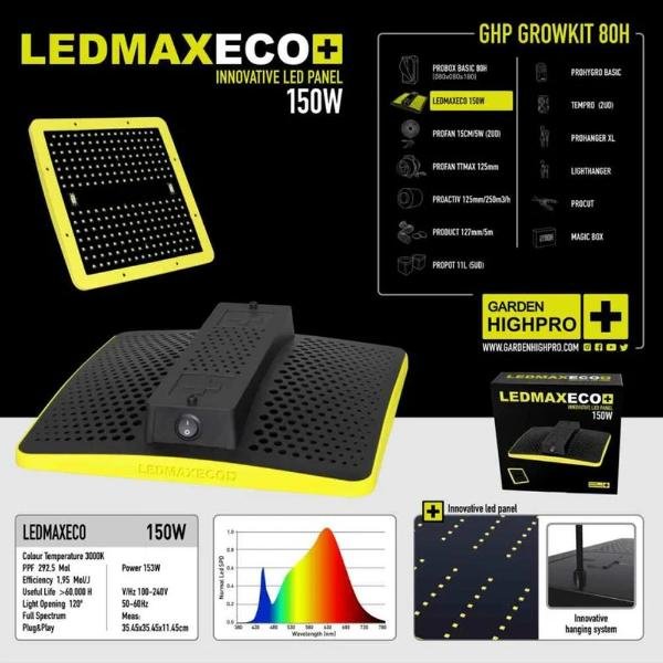 - Современное светодиодное освещение: LEDMAXECO 150 Вт имитирует солнечный спектр, оптимизирует фотосинтез и потребляет мало энергии.