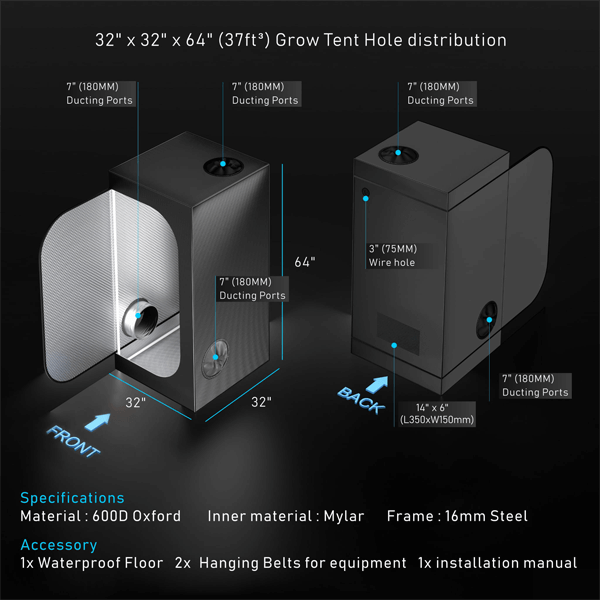 - Особо плотная ткань Oxford: изготовлена из высококачественного материала Oxford, устойчивого к разрывам. Внутренняя часть из материала Mylar, который повышает эффективность освещения в палатках для выращивания. Также стоит отметить, что поверхности палатки изготовлены из экологически чистых, нетоксичных и не имеющих запаха материалов.