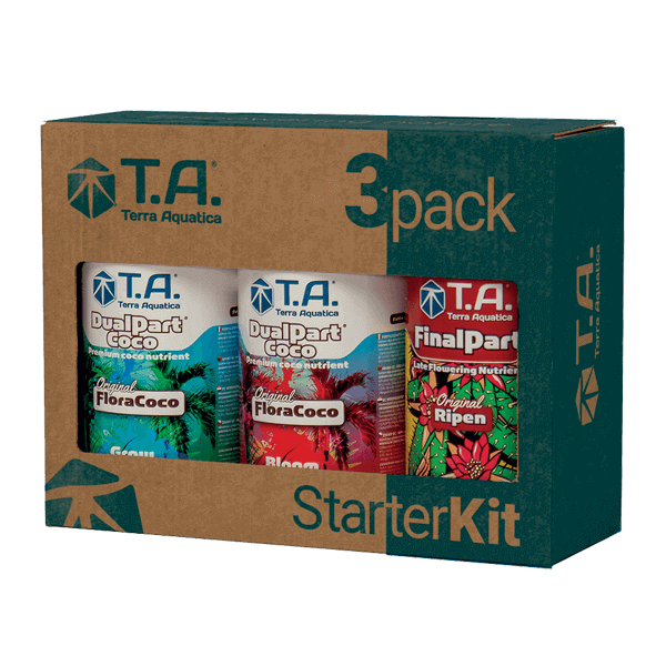 В набор входят удобрения для стимулирования роста «Terra Aquatica DualPart Coco Grow» 500 мл, удобрения для стимулирования цветения «Terra Aquatica DualPart Coco Bloom» 500 мл, удобрения для стимулирования созревания урожая «Terra Aquatica FinalPart» 500 мл, а также упаковка порошка для понижения pH воды.